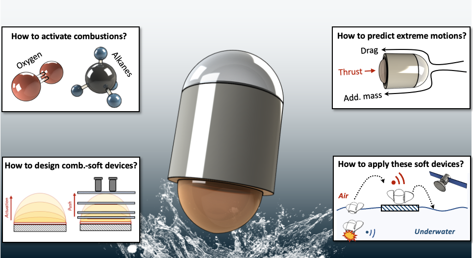 Combustion-enabled soft robots represent a unique category of extreme pneumatic soft robots, propelled by the ignition of premixed combustible gas with a high energy density. The pioneering principle of applying explosions as an actuation method for soft robots was introduced by excellent soft robotics researchers, including Profs. Michael T. Tolley, Robert F. Shepherd, George M. Whitesides, and Robert J. Wood [1-3]. Drawing inspiration from their groundbreaking ideas, my previous works on combustion-actuation have been dedicated to enhancing the understanding of “how to precisely control combustion-enabled soft robots, enabling them to execute agile and rapid motions underwater.”