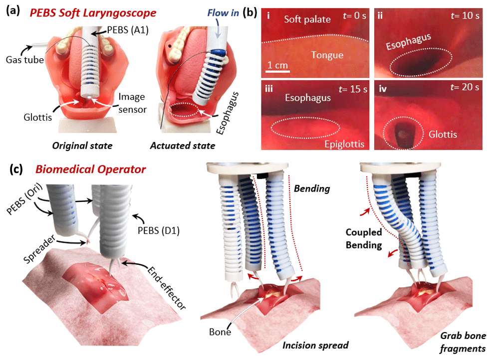 Figure 3. A lightweight pneumatically elastic backbone structured (PEBS) soft actuator can be designed into biomedical tools, such as PEBS soft laryngoscope and biomedical operators.