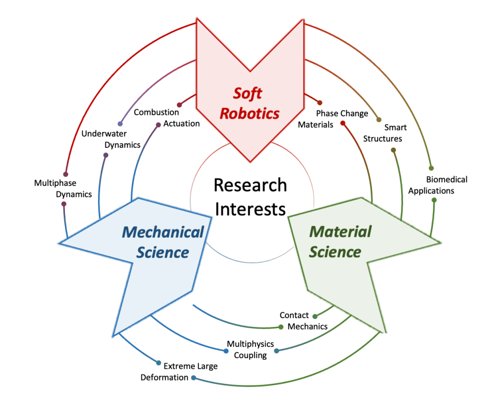 Figure 1. A diagram of my research interests, including three main perspectives: soft robotics, mechanical sciences, and material sciences.